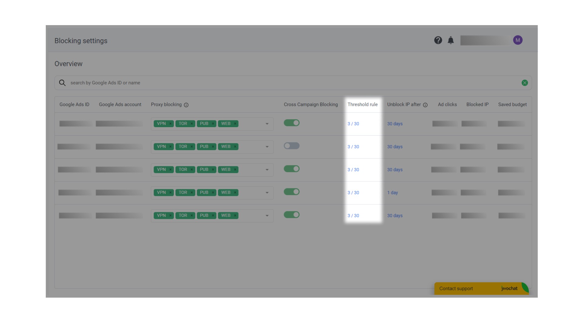 Threshold Rules can be found in your PPC Shield platform under “Blocking Settings”